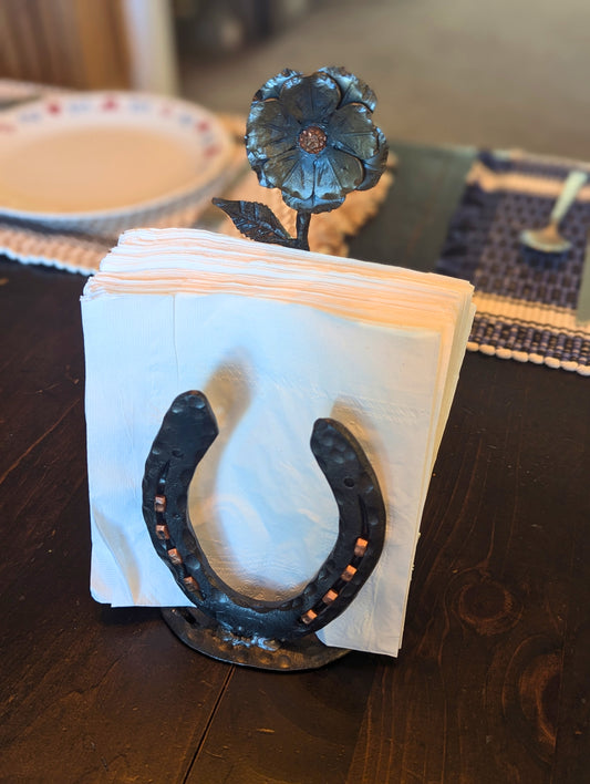 Forged Steel Napkin Holder w/ Horseshoe and Flower Accent – Rustic Kitchen Accessory, Flower Design for Pony Lovers, Ranch & Farm Decor