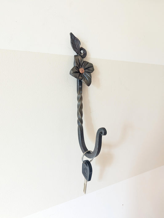 Forged Steel Key/Towel Hook- Small/Large Flower Leaf Design, Handmade w/ Twisted Accent- Blacksmith Created Kitchen, Entryway, Bathroom Dec.