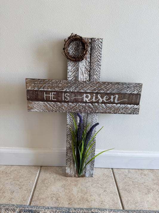 Amish Made Wooden "He is risen" Cross Decor | Wood Lathe Cross | Rustic Farmhouse Christian Home Decor | White or Natural Wood