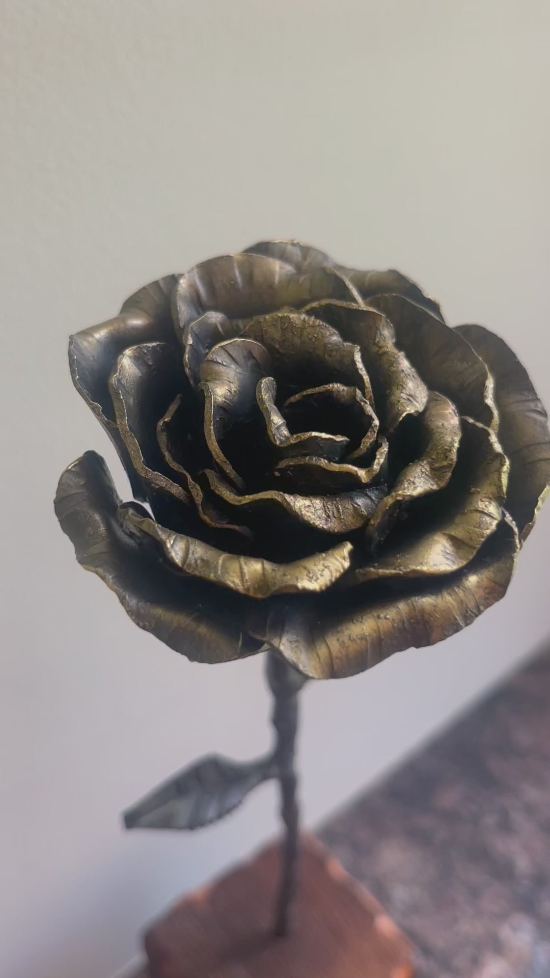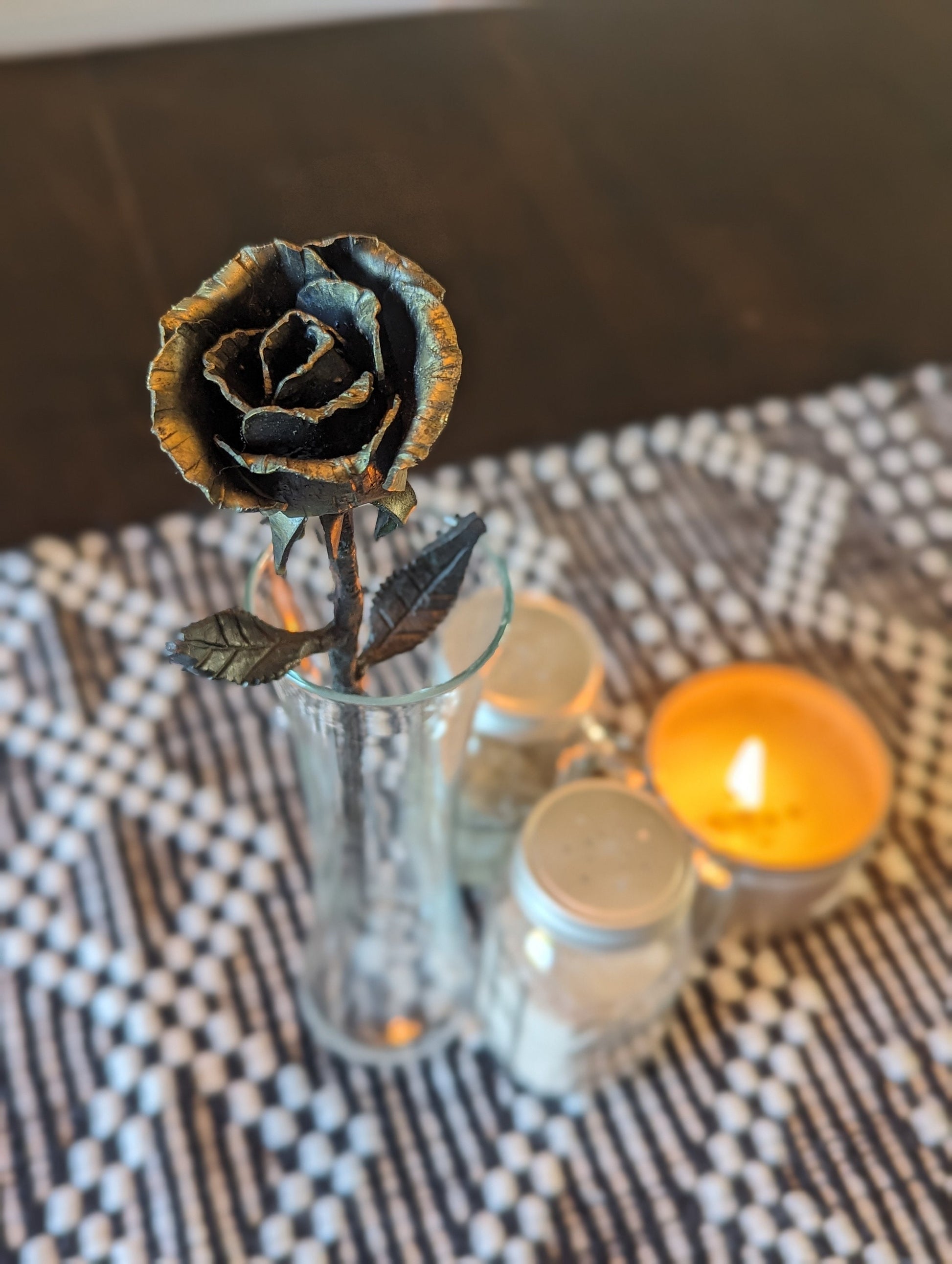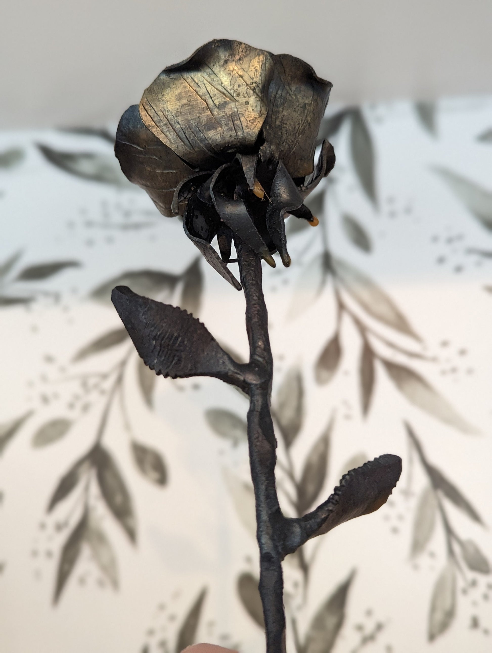 Discover the timeless beauty of a rose that will never fade with our Handcrafted Metal Rose, carefully forged by a skilled Amish blacksmith. The lifelike petals and leaves are carefully shaped and textured, capturing the natural elegance of a real rose in durable metal. Crafted from steel pieces, bolts and screws, these roses are designed to last forever, making it a perfect symbol of everlasting love or a unique decorative piece for your home. Each petal and leaf is individually hand-forged and assembled, ensuring that no two roses are exactly alike. Upon finish, every flower is coated in beeswax - a preservative that keeps them from rusting.