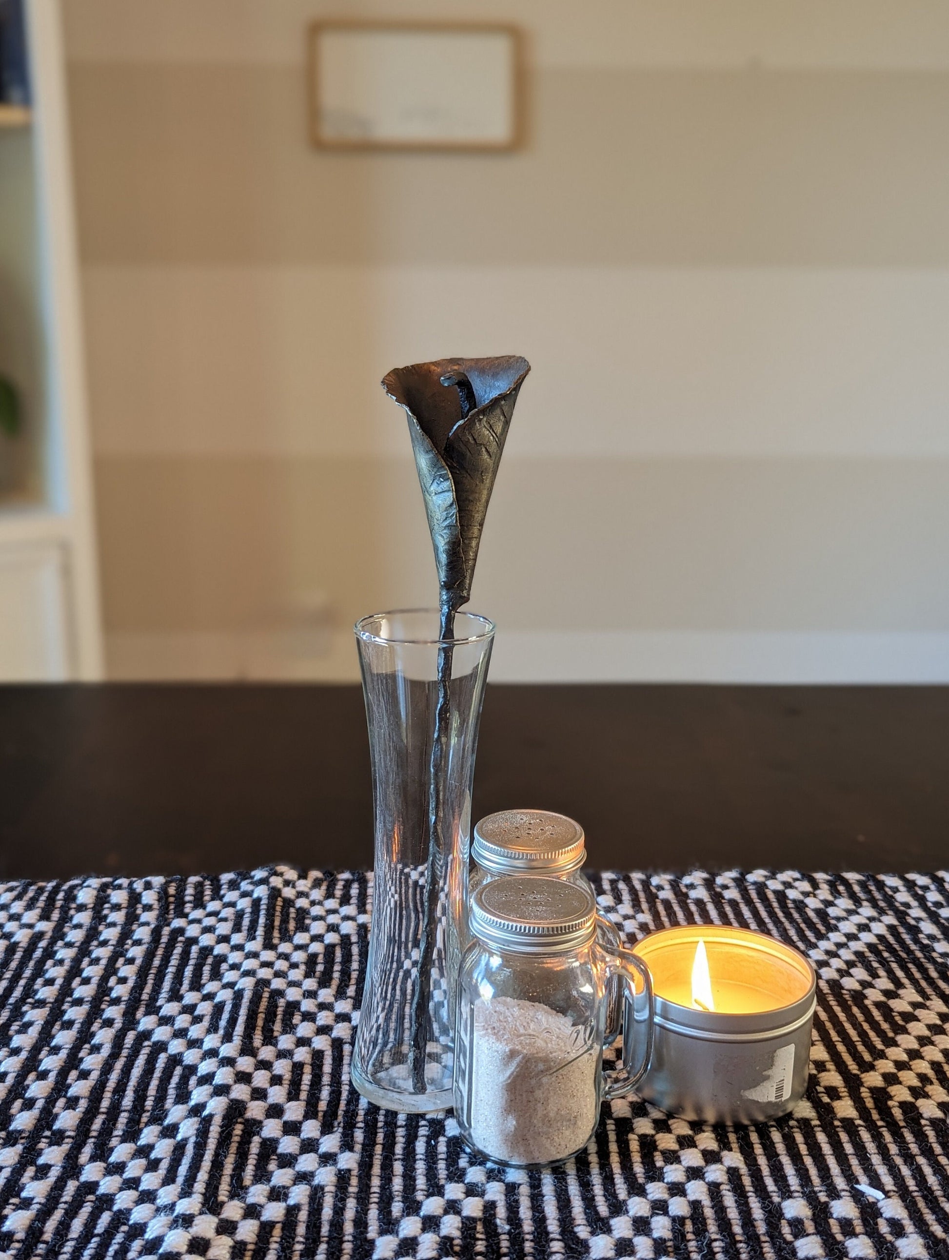 Discover the timeless beauty of a Calla Lily that will never fade with our Handcrafted Calla Lily, carefully forged by a skilled Amish blacksmith. The lifelike petals are carefully shaped and textured made from scrap steel, capturing the natural elegance of a real flower in durable metal.