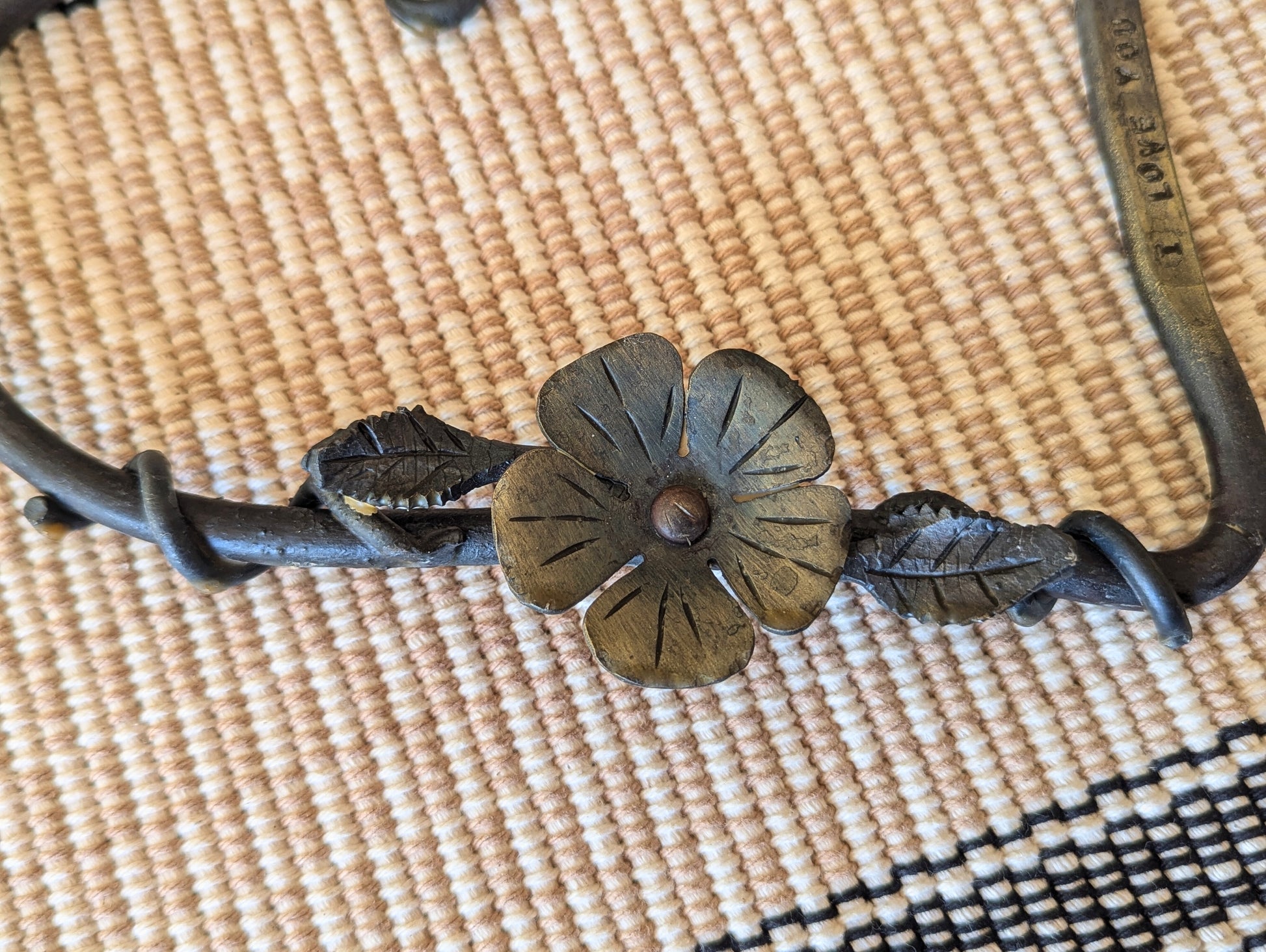 Amish handmade steel heart décor, accented with delicate flower and leaf details.