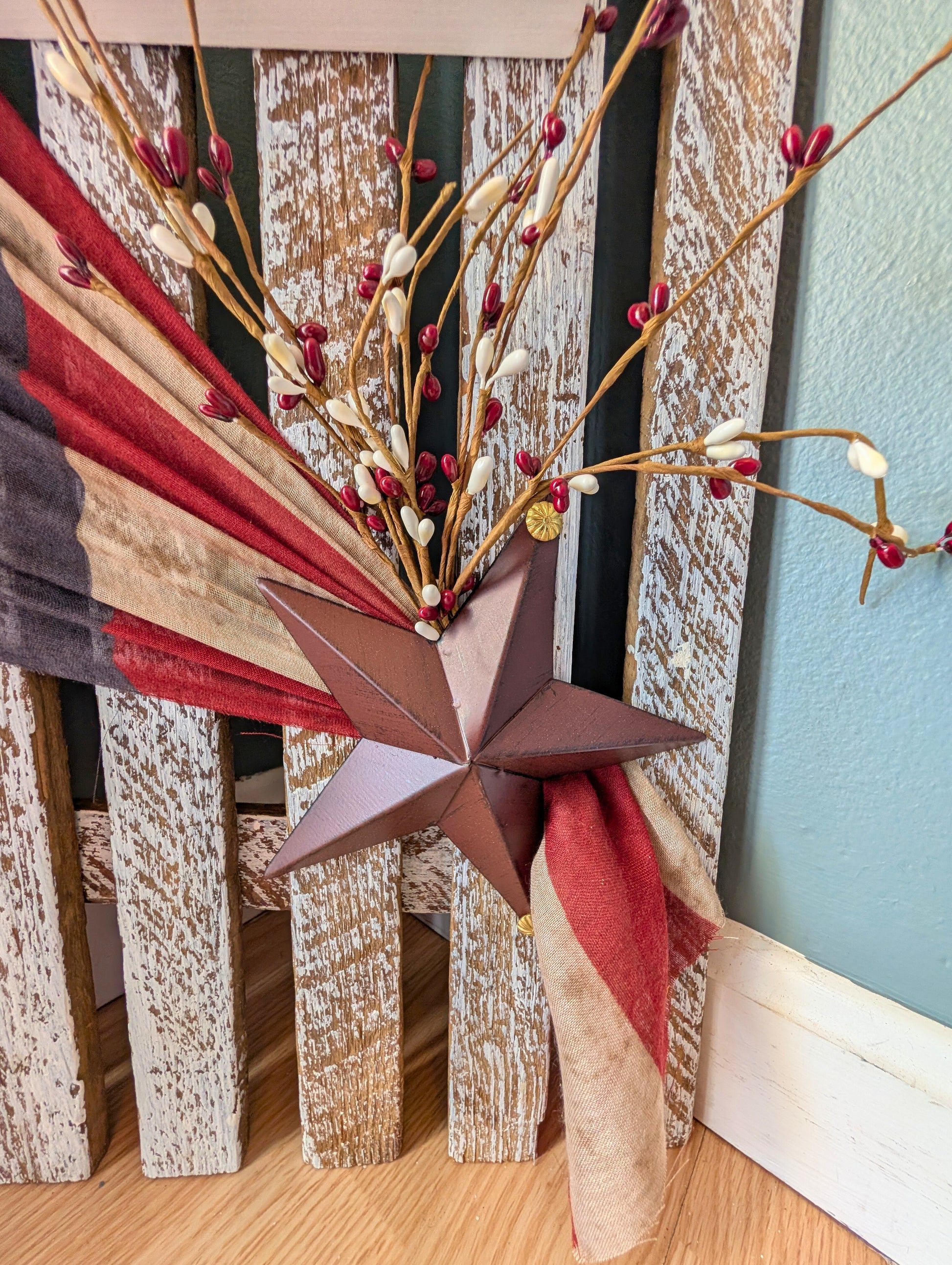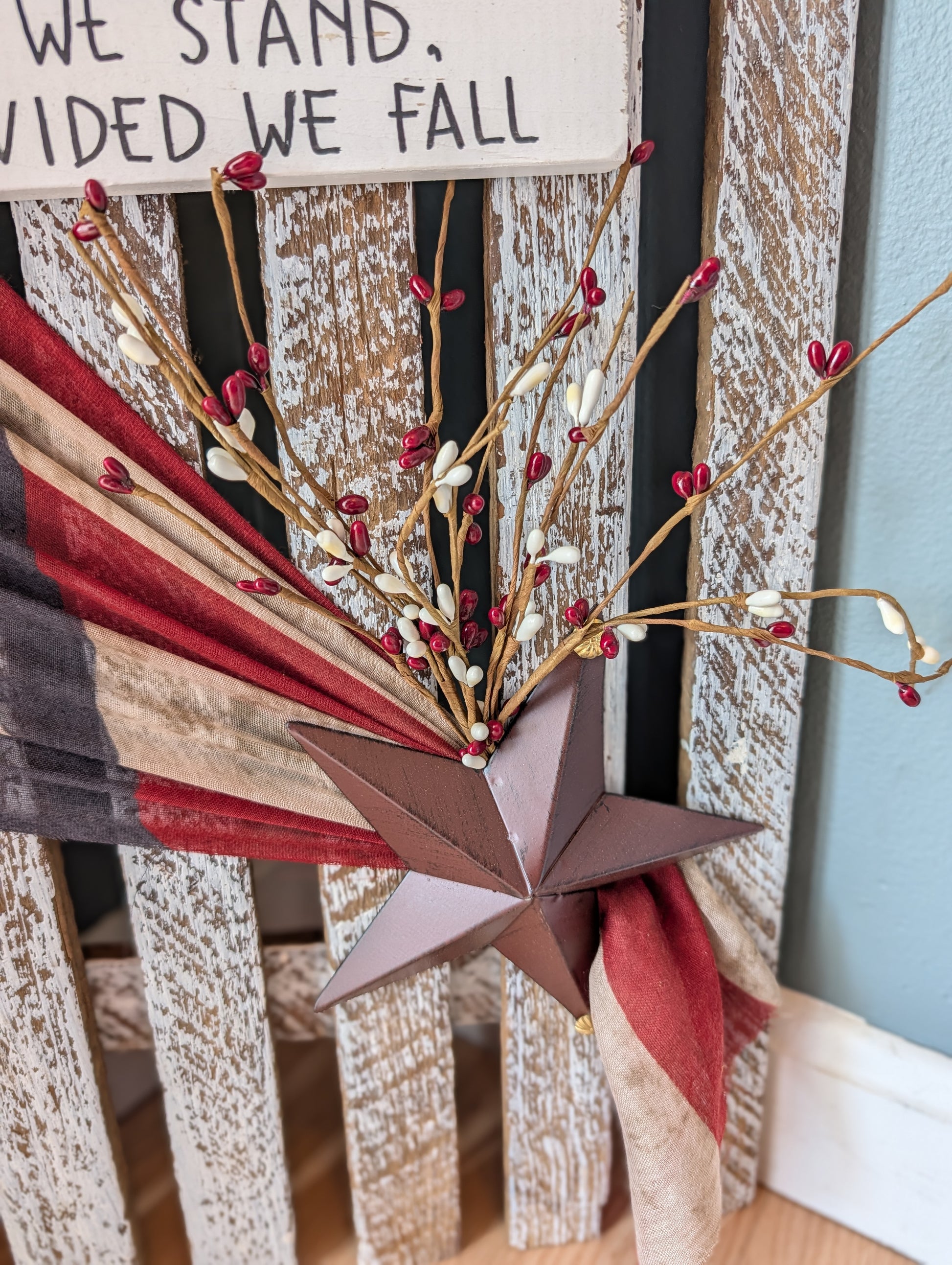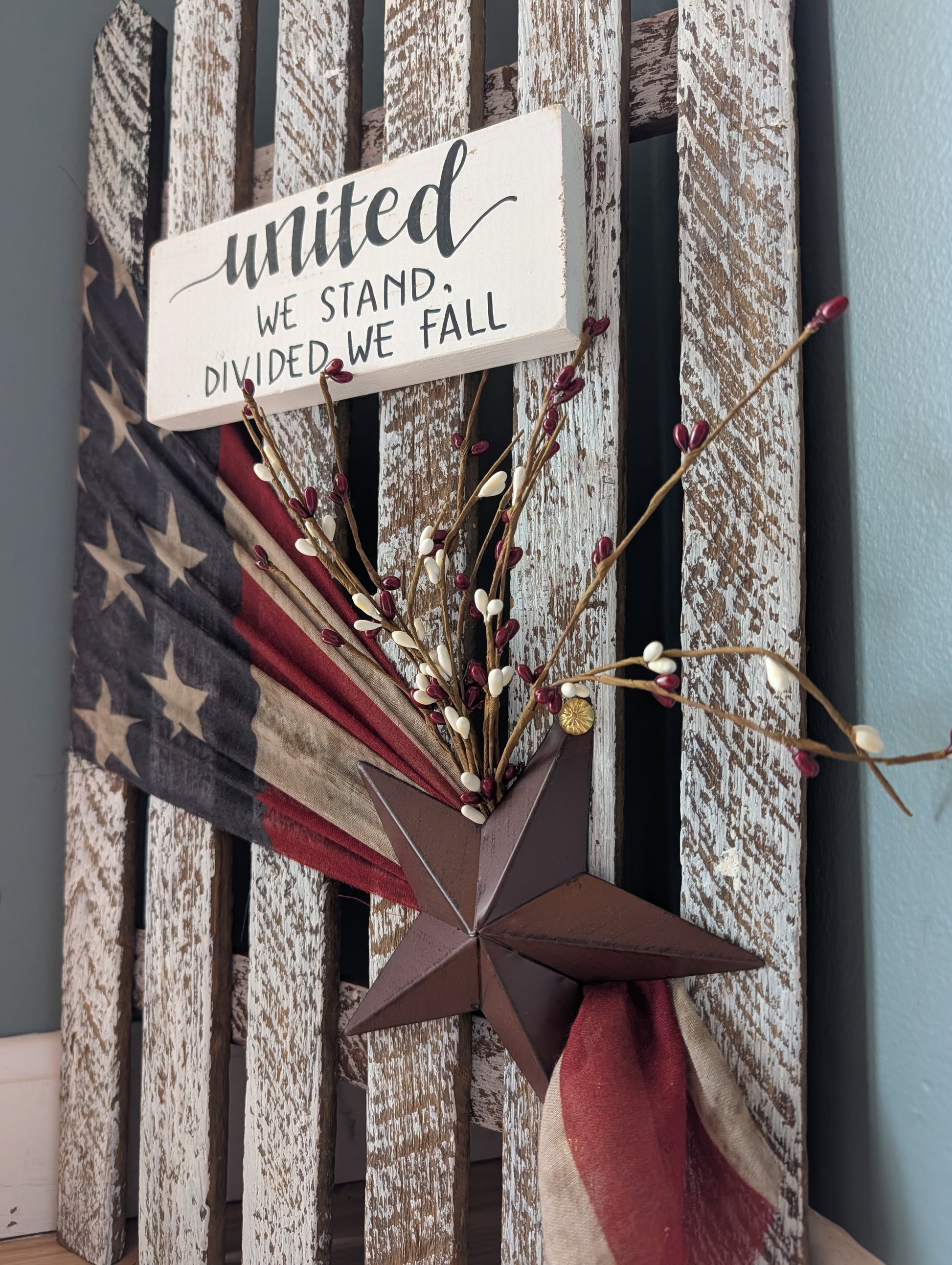 Designed to resemble a vintage picket fence, this piece features distressed wood, black lettering, and accents including a patriotic scarf, star, & branches