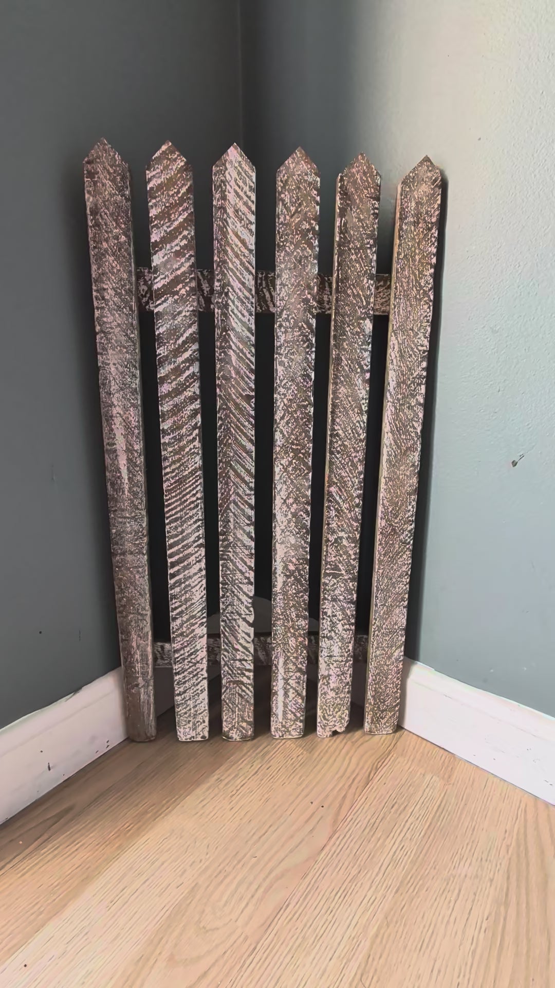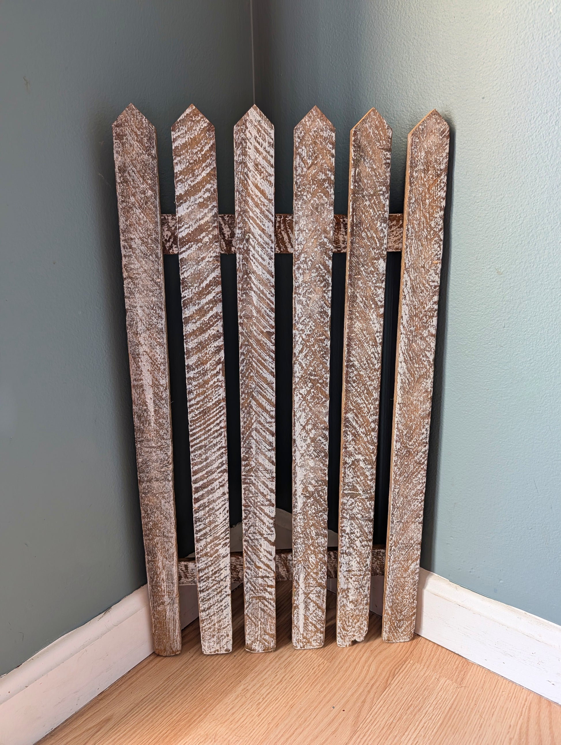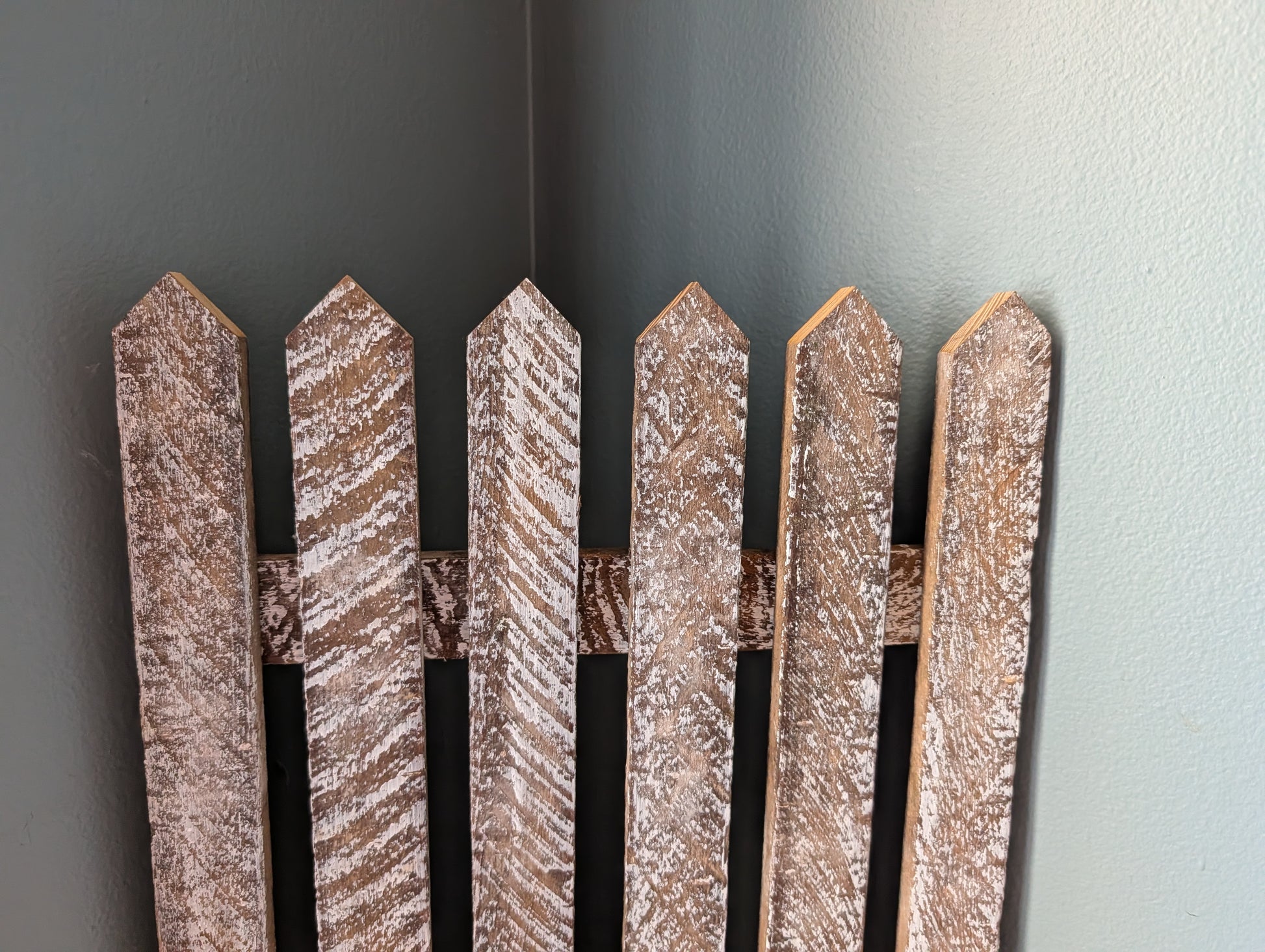 Designed to resemble a vintage picket fence, this piece features distressed wood and rustic charm.