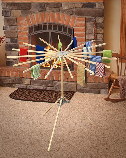 This beautifully crafted wooden clothes drying rack is handmade by Amish using natural maple wood. The spiral design of the rack maximizes drying space while taking up minimal floor space. The rack's arms fold up for easy storage, and each folding arm is 20" long, providing 26 feet of drying space when fully extended.