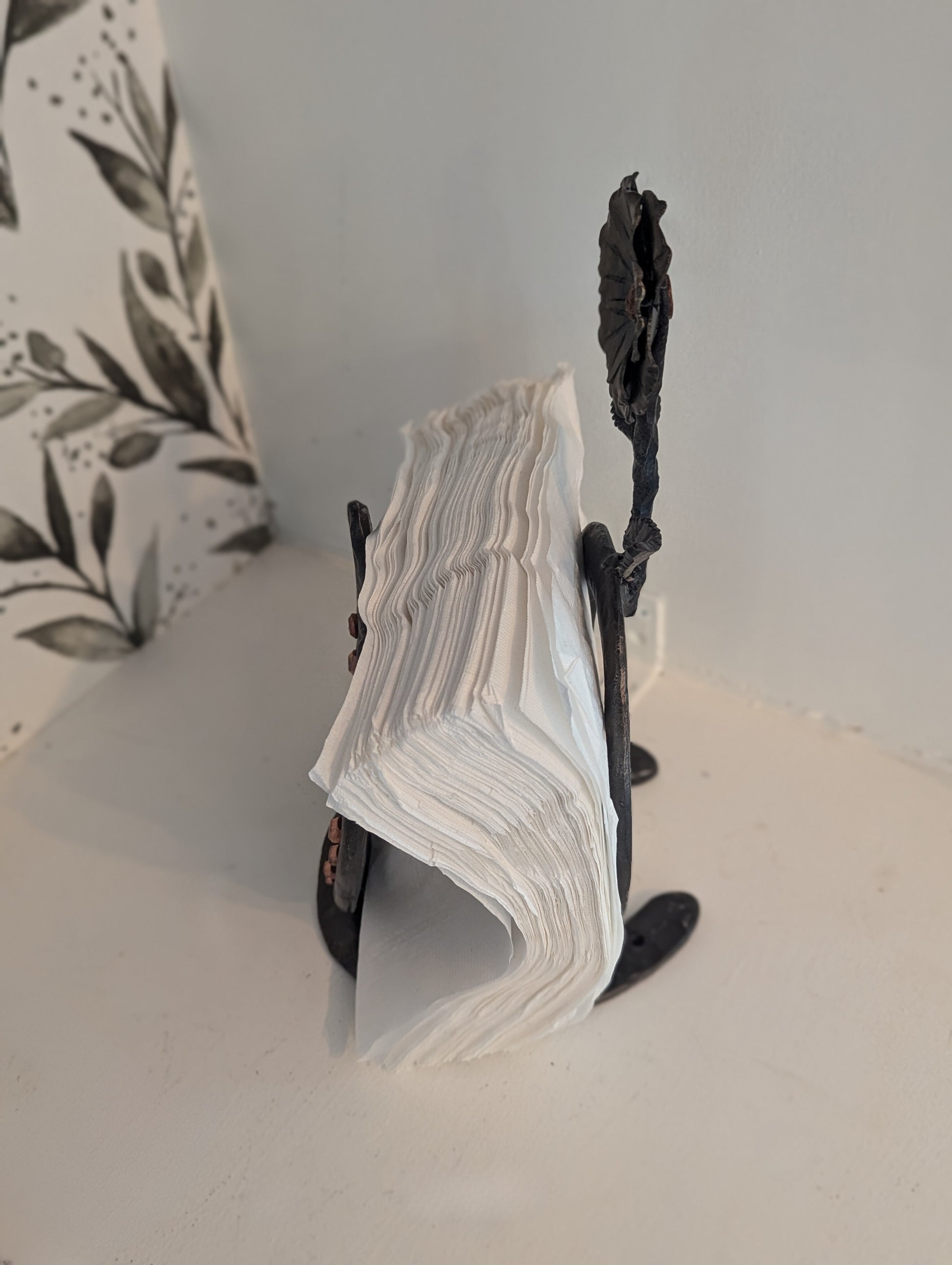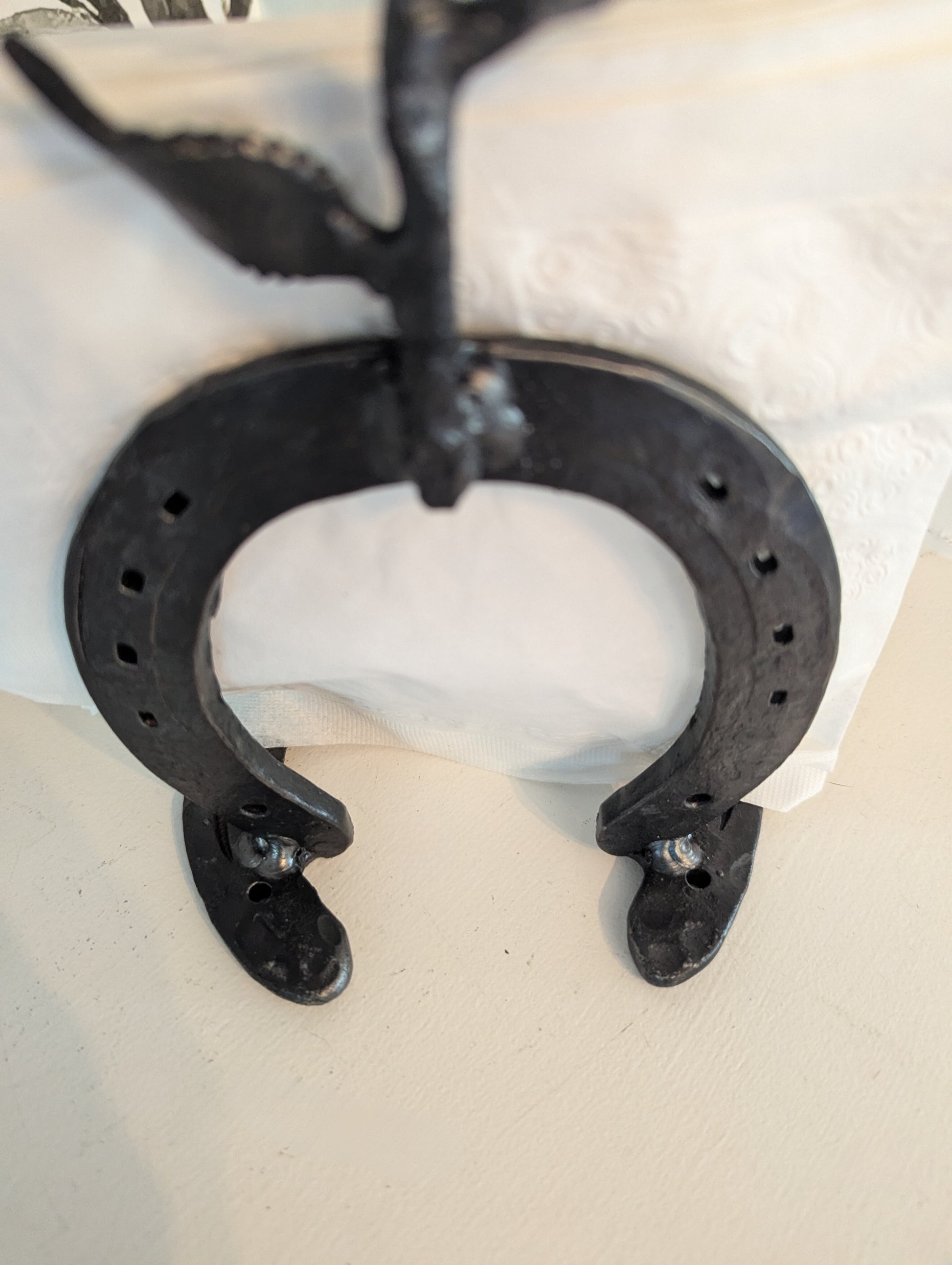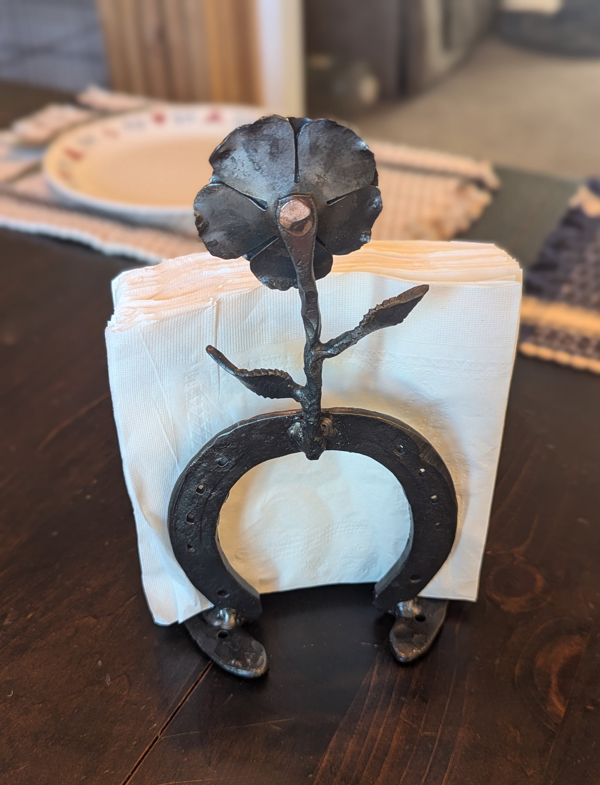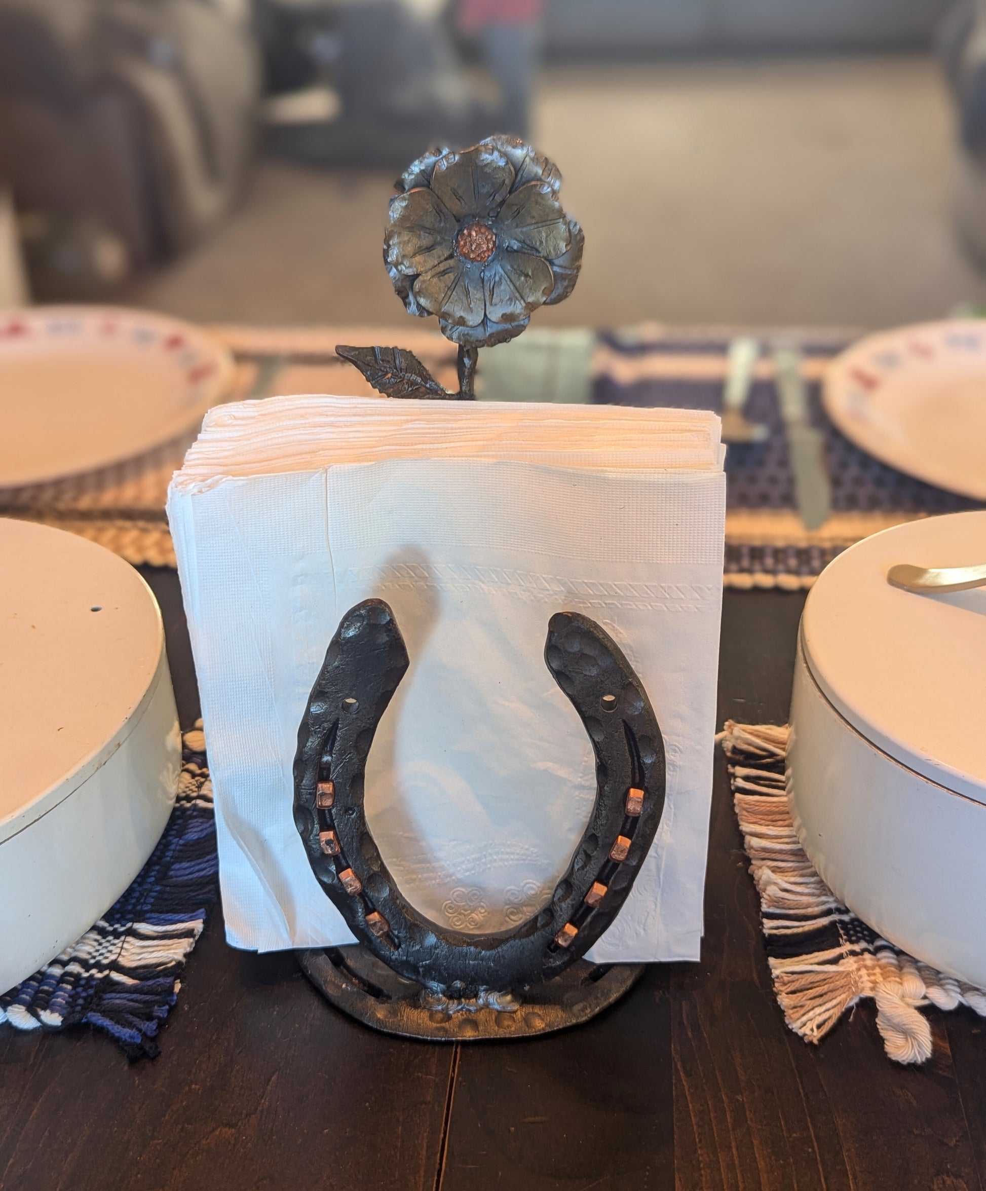 Hand-Forged Steel Napkin Holder with Horseshoe Accent.