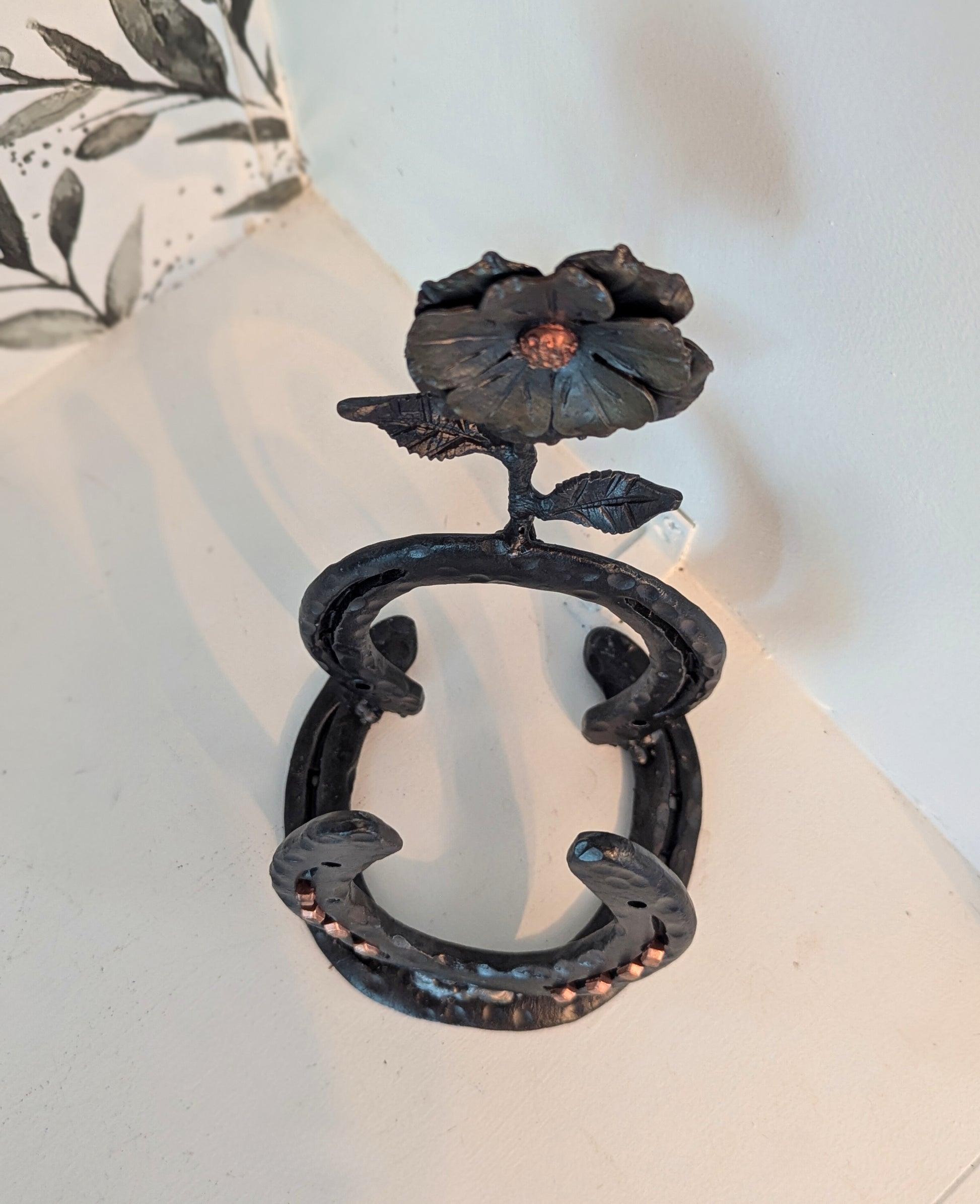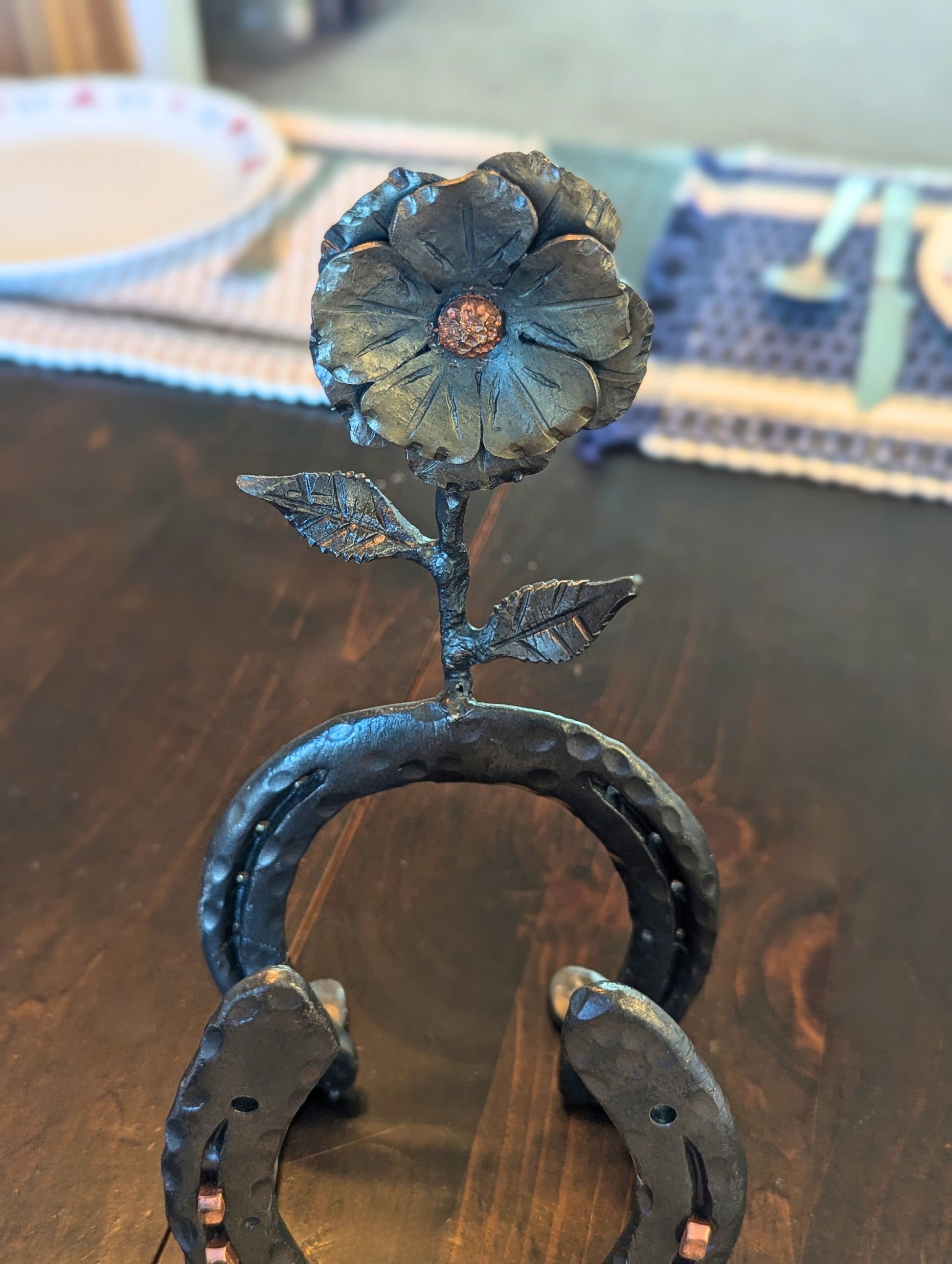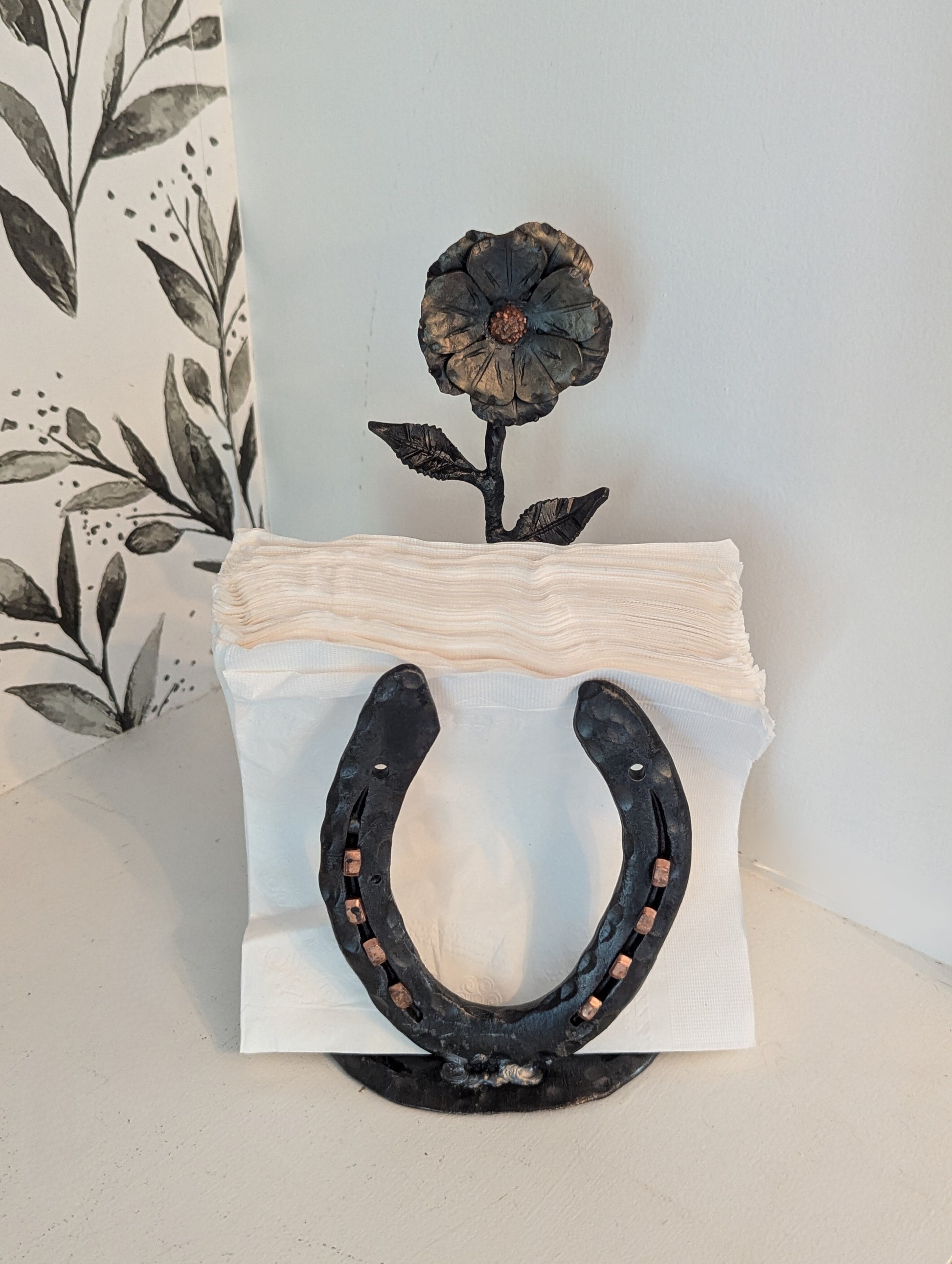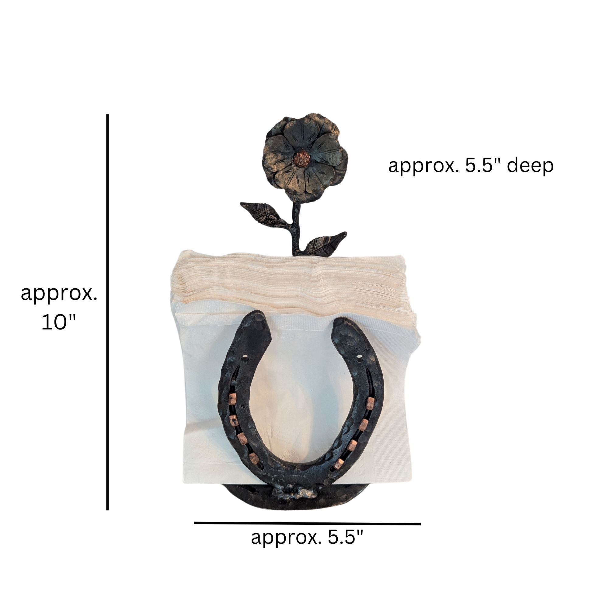 Forged Steel Napkin Holder w/ Horseshoe and Flower Accent – Rustic Kitchen Accessory, Flower Design for Pony Lovers, Ranch & Farm Decor