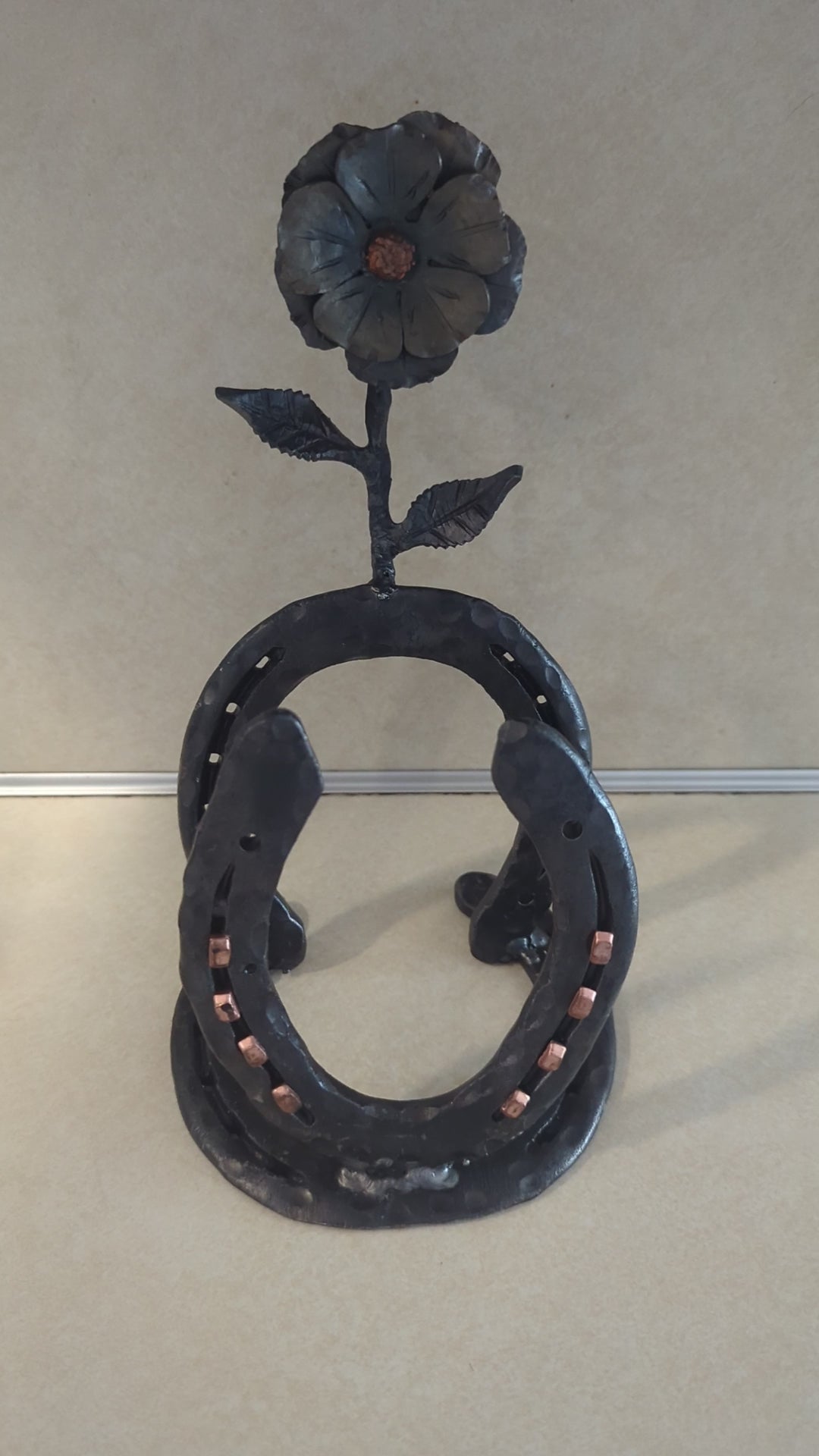 Crafted by an Amish blacksmith from durable steel, this hand-forged napkin holder features a unique horseshoe accent with a beautiful flower design. Perfect for any kitchen accessory or as a flower napkin holder to add a touch of rustic charm to your space. Ideal for pony lovers, ranch decor, farm decor, or as a homestand decoration in any home.