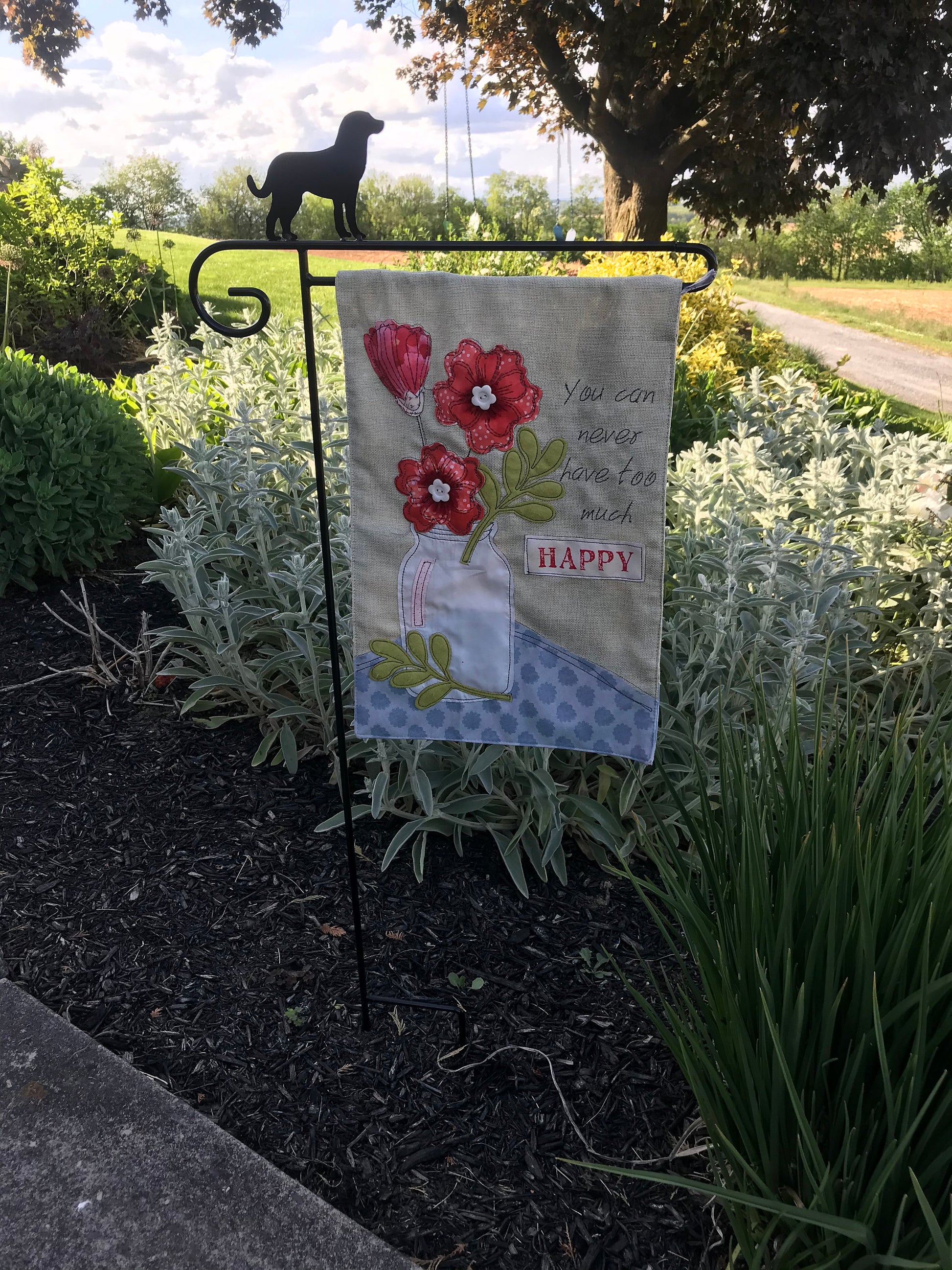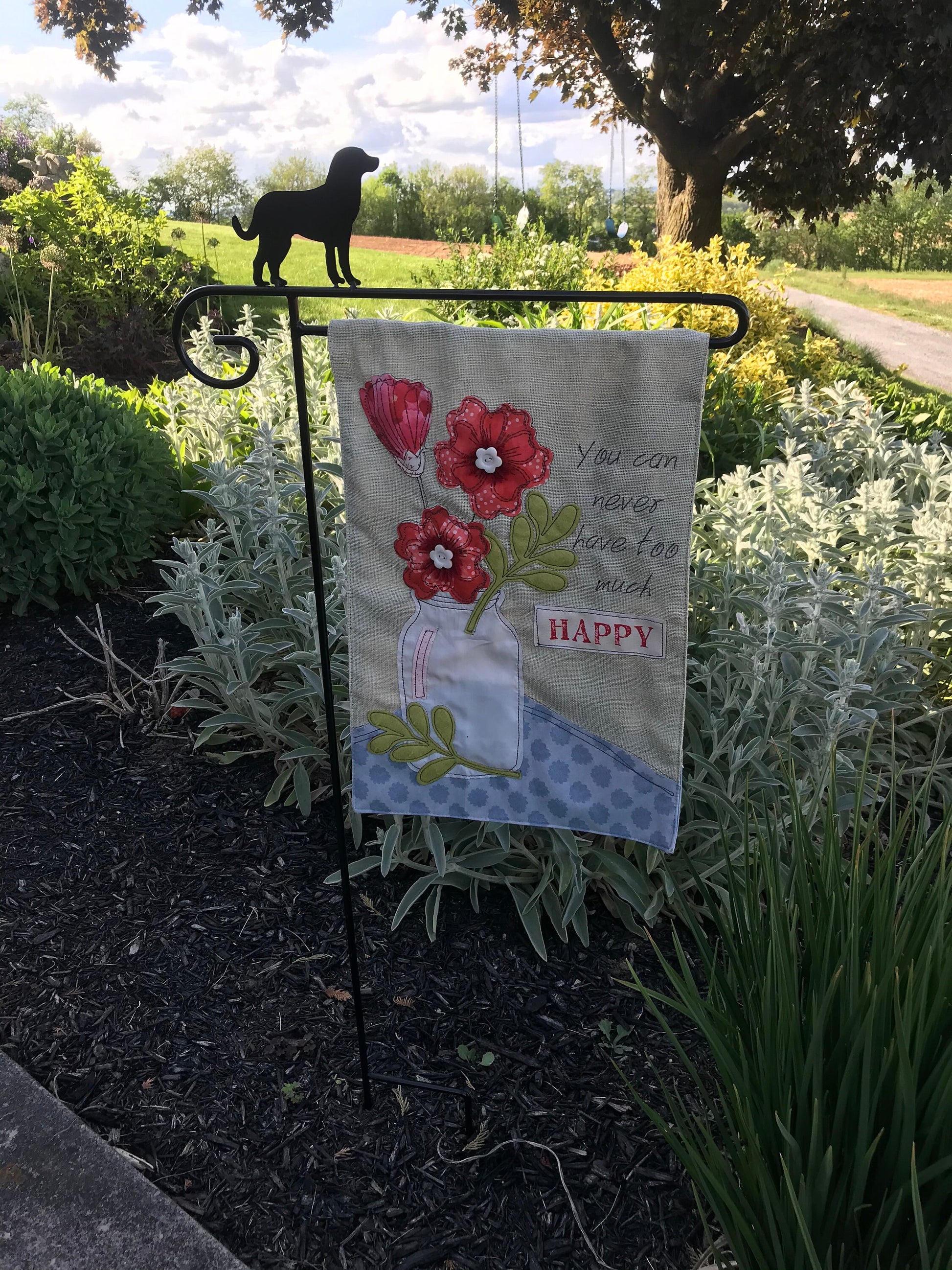 Black Heavy Duty Powder Coated Garden Flag Holder with a Puppy Dog on the top.