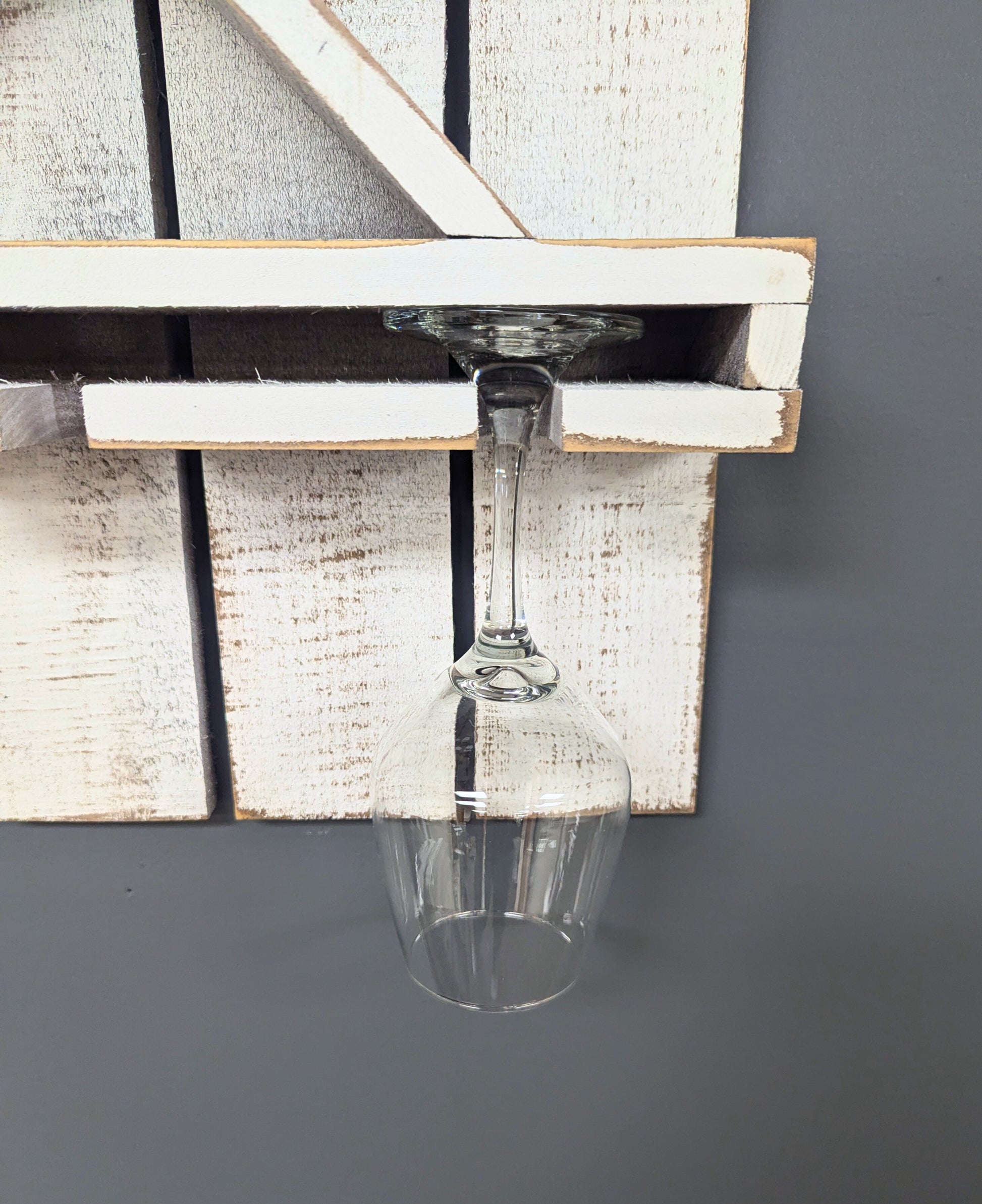 This compact wine storage solution securely holds one bottles and two glasses, featuring a built-in wine glass hanger to keep your stemware within reach. Available in white or stained finish. Each rack has 2 wall bracket mounts for hanging. Other hardware is not included. **We recommend screwing the rack directly to wall if possible for a more secure hold.