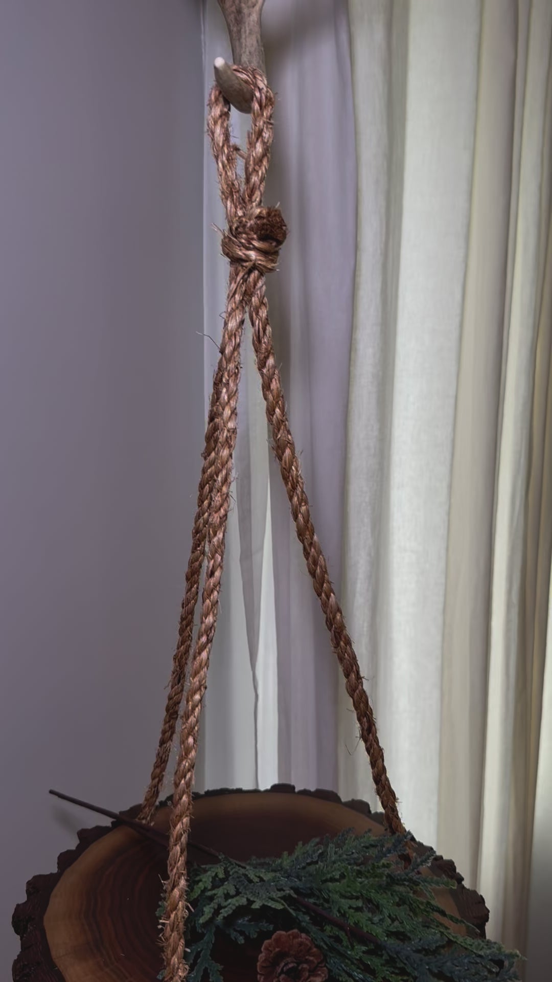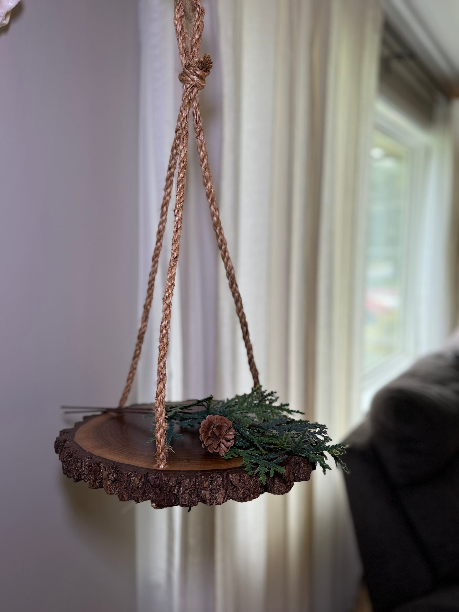 Elevate your space with this stunning, handcrafted live edge hanging shelf, meticulously made by Amish. Crafted from genuine, hand-cut wood and suspended by sturdy natural straw rope, this piece brings rustic charm to any room.