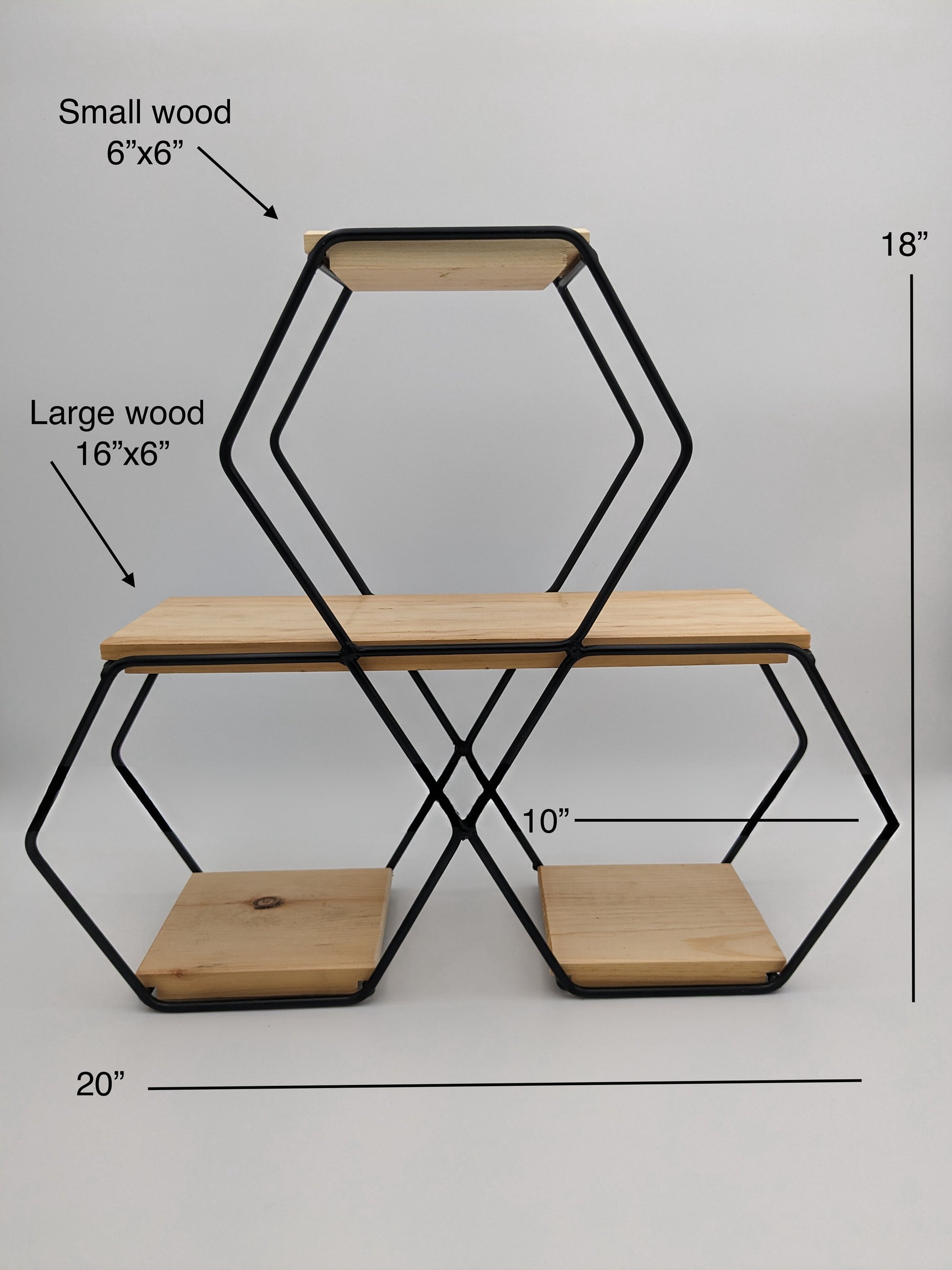-Measurements: 20" wide, 18" high, with each hexagon 9"x9" size. The large wood shelf, measuring 16"x6", along with three smaller 6"x6" wood shelves.